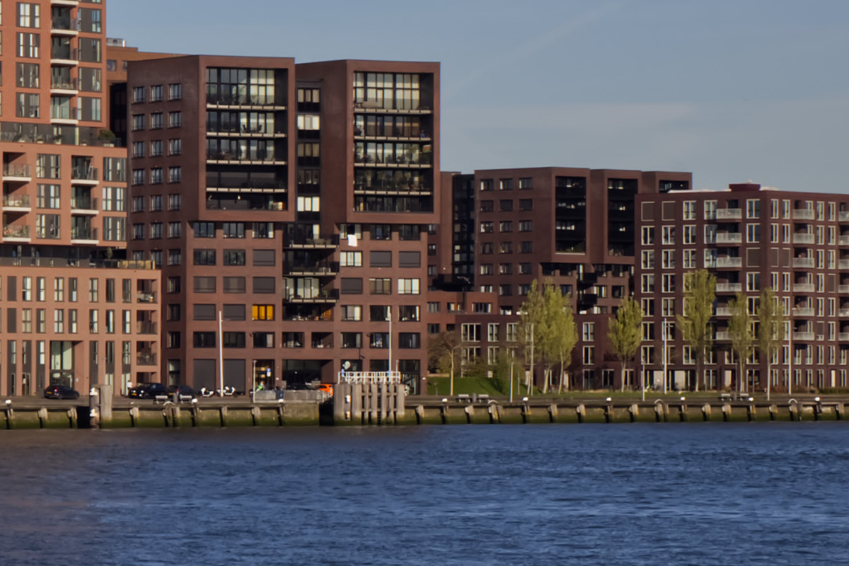 Vanaf de jaren ’90 werd het gebied herontwikkeld tot onderdeel van het Lloydkwartier: een woon- en werkgebied waarin industriële geschiedenis en moderne architectuur samenkomen. De gebouwen op de foto laten die gelaagdheid goed zien. Links valt het speelse, blokvormige ontwerp op, met een gevel die doet denken aan gestapelde containers — een subtiele verwijzing naar het havenverleden. Rechts rijzen warmgekleurde bakstenen torens op, die met hun hoogte en ritme een nieuw stedelijk silhouet vormen.